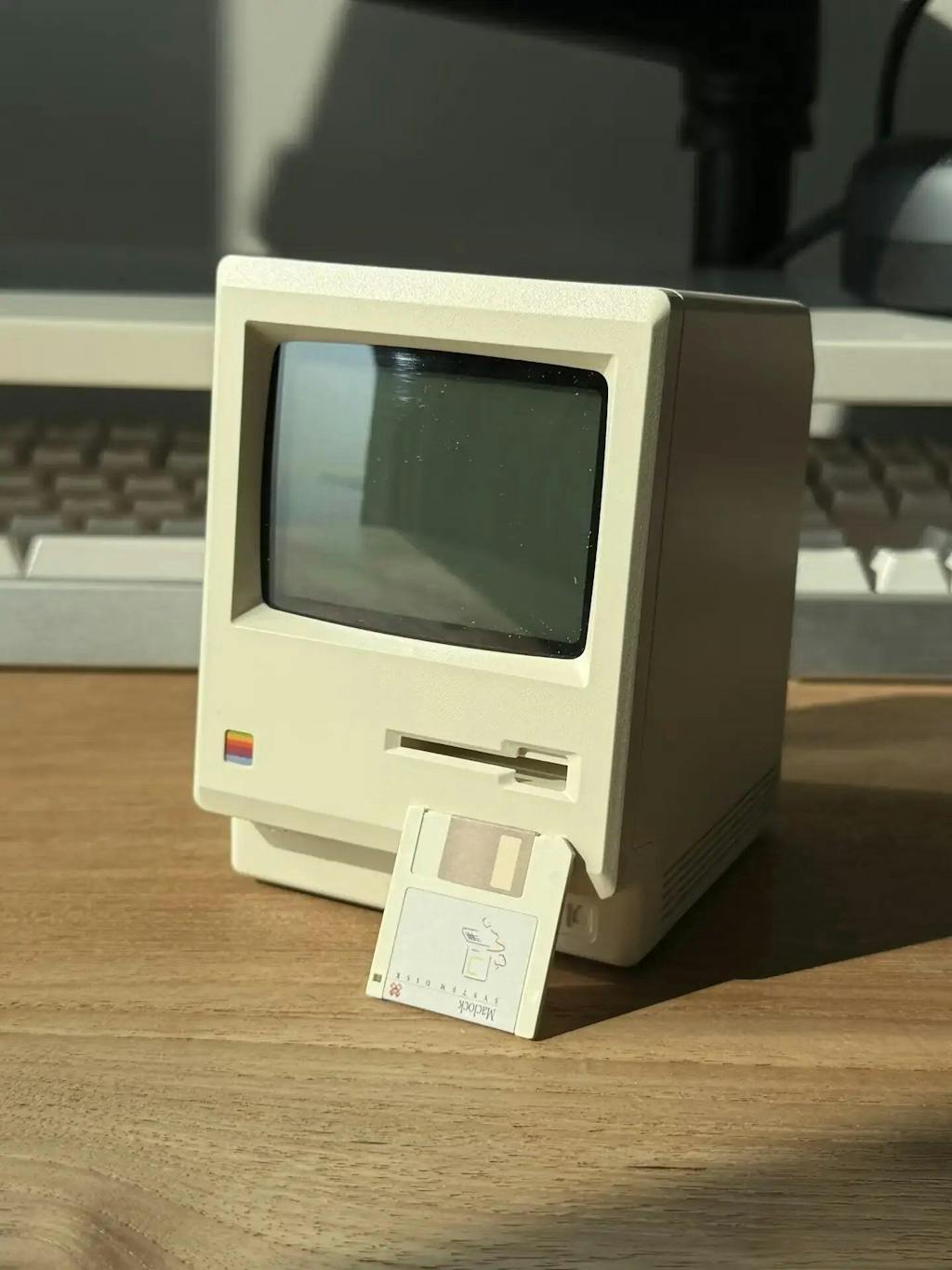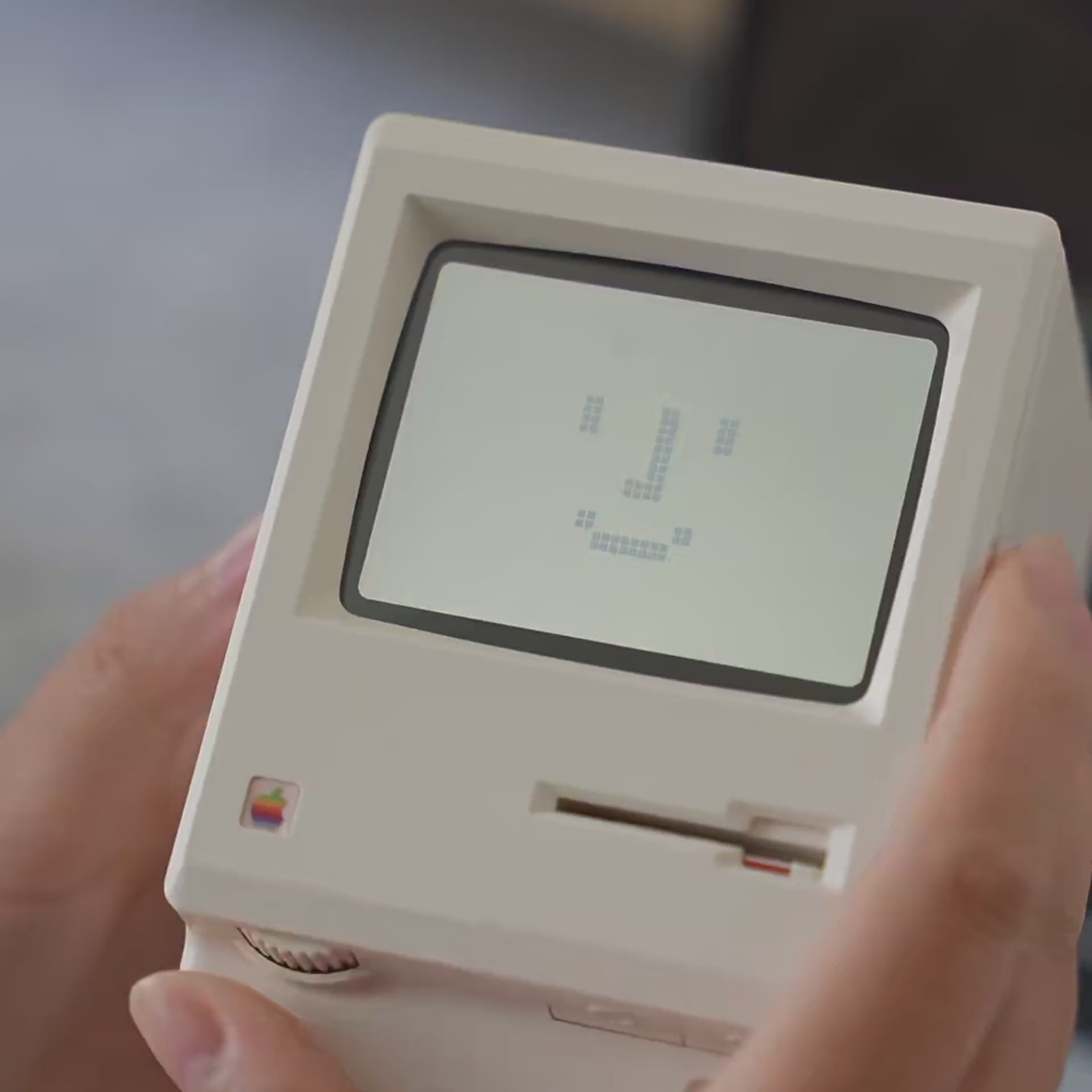 Insert the system disk to reveal the iconic smiley face startup — a familiar moment brought back through physical interaction.